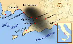 دمر إندلاع بركان جبل فيزوف في عام 79 بعد الميلاد المدن الرومانية بومبي وهيركولانيوم وأوبلونتيس وستابيا ، بالإضافة إلى العديد من المستوطنات الأخرى. أدى الانفجار إلى إخراج سحابة من الحجارة والرماد والغازات البركانية إلى ارتفاع 33 كيلومتر (21 ميل) واندلاع الصخور المنصهرة والخفاف المسحوق بمعدل 6×105 متر مكعب (7.8×105 ياردة3) في الثانية[3] مطلقا في النهاية 100000 ضعف الطاقة الحرارية المنبعثة من القصف الذري لهيروشيما وناجازاكي.[4] يُعتقد أن أكثر من 1000 شخص لقوا حتفهم في إندلاع البركان على الرغم من أن العدد الدقيق للقتلى غير معروف. تتألف رواية شاهد العيان الوحيد الباقي على قيد الحياة والناجي من الحدث من رسالتين أرسلهما بليني الأصغر إلى المؤرخ تاسيتس.[5]