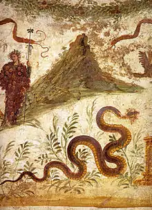 لدى فيزوف تقليد تاريخي وأدبي طويل. كان يُعتبر إلهًا من نوع جنيوس في وقت إندلاع 79 م: يظهر تحت الاسم المدرج فيزوف باعتباره ثعبانًا في اللوحات الجدارية المزخرفة للعديد من اللاراريات (باللاتينية: lararia) أو مايعرف بالأضرحة المنزلية الباقية من بومبي. إن نقش من كابوا [7] إلى ايوفي فيسفيو IOVI VESVVIO يشير إلى أنه كان يعبد كقوة للإله جوبيتر؛ هذا هو الإله جوبيتر فيزوف (باللاتينية: Jupiter Vesuvius).[8]