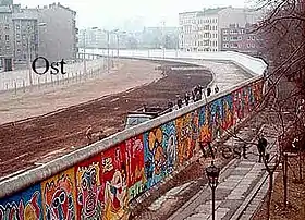 جدار برلين (بالألمانية: Berliner Mauer برلينر ماور) كان جدارا طويلا يفصل شطري برلين الشرقي والغربي والمناطق المحيطة في ألمانيا الشرقية، ولقد كان الغرض منه تحجيم المرور بين برلين الغربية وألمانيا الشرقية، وبدأ بناؤه في 13 أغسطس 1961، وجرى تحصينه على مدار الزمن، ولكن تم فتحه في 9 نوفمبر 1989 وهدم بعد ذلك بشكل شبه كامل.[3][4][5]