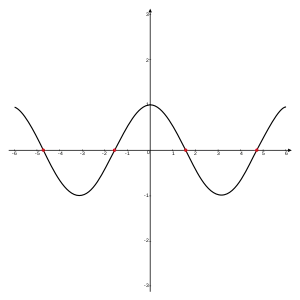 مخطط تابع الجيب الرياضي، النقاط الحمراء توضح جذور المعادلة (نقاط التقاطع مع محور السينات)