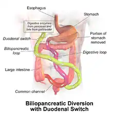 تعد عملية تحويل الإثني عشر نوعًا من أنواع جراحة تغيير مسار عصارة البنكرياس والقنوات المرارية. فيها يتم استئصال جزء من المعدة وقوسها الأكبر. يتم تشكيل المعدة على شكل أنبوب بحجم 150 مل. وعن طريق تقليل حجم المعدة بهذه الطريقة يتم تقييد الاستهلاك الغذائي أيضا في هذه العملية. هذا النوع من الاستئصال المَعدي يعد تشريحيا ووظيفيا لا رجعة فيه. بعد ذلك يتم فصل المعدة من الإثني عشر ووصلها بالجزء السفلي من الأمعاء الدقيقة. يتم إعادة توصيل الإثني عشر والجزء العلوي من الأمعاء الدقيقة بالجزء الباقي على بعد 57-100 سم من القولون.