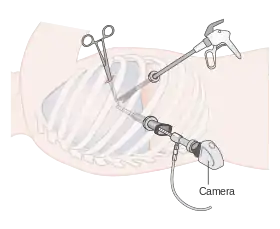 ![]() مُخططٌ يُظهر جراحة صدرية تنظيرية مدعومة بالفيديو | |