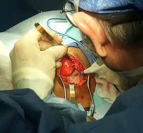 ![]() جراحٌ يستعمل الجراحة الكهربائية في استئصال ورمٍ شحمي | |