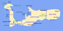 - بودن تاون - تأسست في عام 1700، وتضم الجزء المركزي من جزيرة جراند كايمان. كانت قرية بودن تاون هي العاصمة الأصلية لجزر كايمان. عدد سكانها حالياً 5,764 نسمة.