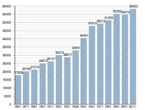 في سنة 1861 بلغ عدد السكان 17٬828 نسمة، وتطور العدد ليصل في سنة 2011 لـ 58٬323 نسمة.