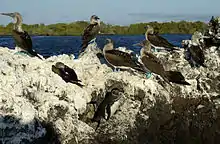 الأطيش أزرق القدمين وبطريق غالاباغوس في خليج إليزابيث، إيزابيلا.