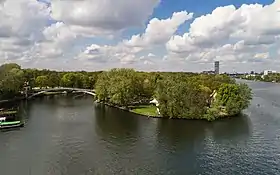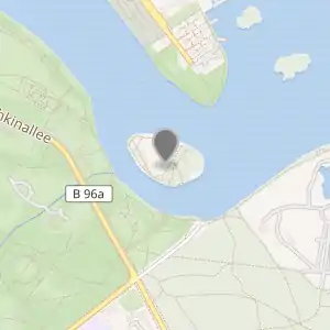 في عام 1896 تم تضمين الجزيرة إلى معرض برلين التجاري في حديقة تريبتور، وتظهر على خرائط في هذه الفترة باسم Neu-Spreeland . سميت فيما بعد بجزيرة كنيسة الدير Abteiinsel ، سميت باسم المطعم الذي تم بناؤه هناك عام 1896 بمناسبة المعرض التجاري على طراز دير اسكتلندي (كنيسة الدير) وأحترق في عام 1914. في ذلك الوقت كان الوصول إلى الجزيرة عن طريق العبارة. في عام 1904 ، كانت هناك خطط أولية لفتح الجزيرة بمساعدة جسر. ومع ذلك، خلق هذا مقاومة كبيرة بين أصحاب المطاعم في تريبتور "Treptow" ، الذين كانوا يخشون من المنافسة. سكان شترالاو "Stralau" قاوموا أيضًا بناء الجسر، لأنه من وجهة نظرهم، كانت الجزيرة تابعة لـ شترالاو "Stralau. ولذلك ينبغي دفع الدخل من الضريبة التجارية لأعمال المطاعم لهم.