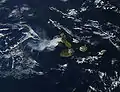 جزيرة فرناندينا خلال اندلاع البركان 11 أبريل 2009 كما يرى من الفضاء. جزيرة إيزابيلا يمكن أيضا أن ينظر إلى الشرق (يمين)