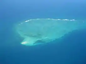 مشهد جوي لجزيرة فونغو ياسيني. الجزيرة عبارة عن ضفة رملية صغيرة دون غطاء نباتي محاطة بشعاب كبيرة. وتظهر هنا في الزاوية اليسرى من أسفل الصورة.
