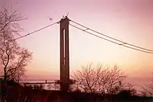 - بسبب ارتفاع البرجين (693 قدم (211 م)) والمسافة بينهما (4,260 قدم (1,298 م)) كان يجب الأخذ في الاعتبار دوران سطح الأرض في تصميم الجسر- حيث تتباعد قمم البرجين 1 5⁄8 بوصة (41.275 مـم) عن قواعدها.[11]