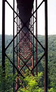 ![]() | 4 | جسر نيو رفر جورج | 518 | 1699 | فولاذ | 1977 | فرجينيا الغربية 38°4′8.6″N 81°4′58.2″W | ||||||