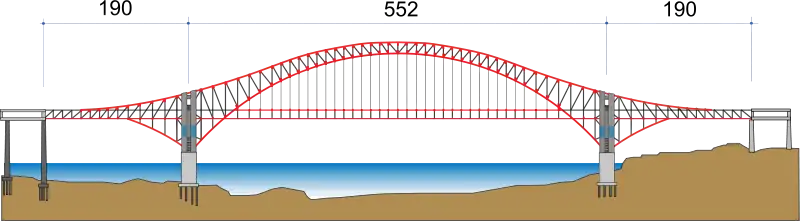 الجسر الرئيسي هو جسر قوسي من نوع بو سترينغ ذو ثلاثة مقاطع (محمل) ممتدة، وأما الجوانب فهي مشبكة وذات ارتفاع متغير. المقطع الموسط للجسر هو قوس حديدي مشبك وصلب، حيث تبلغ المسافة الموجودة بين قمة القوس وقاعدة المحمل 142 متر. الوتر السفلي للقوس هو في شكل شلجم و تبلغ المسافة الفاصلة بينه وبين القاعدة 128 متر (من القاعدة للقمة في الوتر السفلي للقوس).