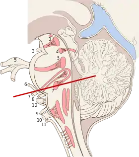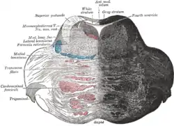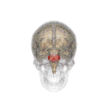 ![]() منظر أمامي سفلي للنخاع المستطيل والجسر منظر أمامي سفلي للنخاع المستطيل والجسر | |
