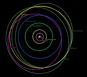 مدارات كوبيوانوس مختلفة بالمقارنة مع مدار نبتون (الأزرق) وبلوتو (الوردي)