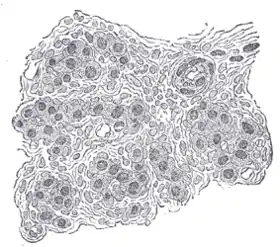 ![]() مقطع جزء من الجسم السباتي تم تكبيره بشكل كبير وعدد كبير من الأوعية الدموية موجود في الجسم. | |