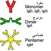 | غلوبيولين مناعي A | 2 | يوجد في المناطق المخاطية مثل الأمعاء، المجاري التنفسية والمجارية البولية، وتحمي هذه المناطق من الاستعمار من قِبل المكروبات.[10] | ![]() |