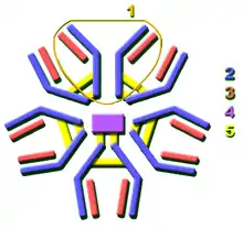 للأجزاء المختلفة من الجسم المضاد وظائف مختلفة.على وجه التحديد ، تحتوي "الأذرع" (التي تكون متطابقة بشكل عام) على مواقع يمكن أن ترتبط بجزيئات معينة ، مما يتيح التعرف على مستضدات معينة.تسمى هذه المنطقة من الجسم المضاد منطقة Fab (جزء ، ربط مستضد).وهو يتألف من مجال واحد ثابت وآخر متغير من كل سلسلة ثقيلة وخفيفة من الجسم المضاد.يتم تشكيل المستوقع عند الطرف الأميني لمونومر الجسم المضاد بواسطة المجالات المتغيرة من السلاسل الثقيلة والخفيفة.يُشار أيضًا إلى المجال المتغير باسم منطقة FV وهي المنطقة الأكثر أهمية للارتباط بالمستضدات. لكي تكون محددًا ، فإن الحلقات المتغيرة من الخيوط ، ثلاثة في كل منها على السلاسل الخفيفة (VL) والثقيلة (VH) مسؤولة عن الارتباط بمولد الضد.يشار إلى هذه الحلقات على أنها مناطق تحديد التكامل (CDRs).تم تجميع هياكل CDRs وتصنيفها بواسطة Chothia et al.ومؤخرا بواسطة North et al.ونيكولوديس وآخرون.في إطار نظرية الشبكة المناعية ، تسمى CDRs أيضًا أنماطًا ذاتية.وفقًا لنظرية الشبكة المناعية ، يتم تنظيم جهاز المناعة التكيفي من خلال التفاعلات بين الأنماط الذاتية. تلعب قاعدة Y دورًا في تعديل نشاط الخلايا المناعية.تسمى هذه المنطقة منطقة Fc (جزء ، قابل للتبلور) ، وتتكون من سلسلتين ثقيلتين تساهمان في مجالين أو ثلاثة مجالات ثابتة اعتمادًا على فئة الجسم المضاد.وهكذا ، تضمن منطقة Fc أن كل جسم مضاد يولد استجابة مناعية مناسبة لمولد ضد معين ، من خلال الارتباط بفئة معينة من مستقبلات Fc ، وجزيئات مناعية أخرى ، مثل البروتينات التكميلية.من خلال القيام بذلك ، يتوسط التأثيرات الفسيولوجية المختلفة ، بما في ذلك التعرف على الجسيمات غير المتجانسة (الارتباط بـ FcγR) ، وتحلل الخلايا (الارتباط بالمكمل) ، وتحلل الخلايا الصارية ، والخلايا القاعدية ، والخلايا الحمضية (الارتباط بـ FcεR).