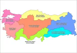 1 الجغرافيا والكونغرس، الذي عقد في أنقرة بين 06-21 يونيو 1941، قسمت تركيا إلى سبع مناطق بعد مناقشات طويلة والعمل. تم فصل هذه المناطق الجغرافية الخاصة بهم وفقا للمناخ، والنباتات، والموقع والحيوانات، والمستوطنات البشرية، والتنوع الزراعي، والنقل، والطوبوغرافيا، وهلم جرا. في النهاية، وكان يسمى المناطق الجانب 4 و 3 مناطق داخلية وفقا لحيهم في البحار الاربعة المحيطة تركيا ومواقفها في الأناضول.
