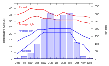 تتميز لاوس بمناخ استوائي موسمي معا موسم من الأمطار من شهر مايو وحتي شهر أكتوبر بينما يتميز المناخ من نوفمبر وحتي فبراير بموسم بارد وجاف بينما يتميز شهري مارس وأبريل بموسم حار وجاف، الرياح الموسمية تحدث بجميع أنحاء البلاد بنفس الوقت على الرغم من اختلافها من سنة الي اخري بينما الأمطار تختلف نسبتها فقد سجلت اعلي كمية 3600 ملليمترا في محافظة تشامباساك بينما سجلت ادني نسبة أمطار في لوانغ برابانغ بحوالي 1360 ملم، الأمطار ليست كافية للزراغة حيث تؤثر بإنتاج الارز سنويا في حالة انخفاضها متوسط درجات الحرارة حول 40 درجة مئوية