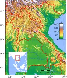 طبوغرافيا لاوس معضمها جبلية تتميز بالتضاريس الحادة والاودية الضيقة بأمكانيات زراعية محدودة وتمتد الجبال عبر معضم شمال البلاد بينما يتمتيز الجنوب بالمساحات الكبيرة التي تكون مناسبة لزراعة الارز وتربية الماشية تصنف 4% من مساحة لاوس الصالحة للزراعة بينما تزيد هذه النسبة نظرا لقطع الأشجار التجاري المستمر