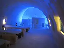 - تُبنى الهياكل والتماثيل الجليدية من قطع كبيرة من الجليد أو عن طريق رش الماء.[20] والهياكل في الغالب تزيينية (كما في حالة القلاع الجليدية)، وليست عملية للسكن طويل الأجل. وتوجد فنادق الجليد على أساس موسمي في عدد قليل من المناطق الباردة. والمبنى القباني هو مثال آخر على الهيكل المؤقت المصنوع أساسًا من الثلج.