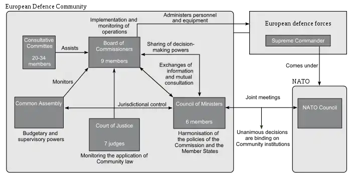 رسم تخطيطي يوضح أداء المؤسسات المنصوص عليها في المعاهدة المنشئة لمجموعة الدفاع الأوروبية (EDC)، ووضع قوات الدفاع الأوروبية تحت تصرف الجماعة، والصلة بين EDC ومنظمة حلف شمال الأطلسي (الناتو):