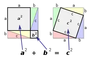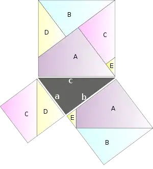 من المعروف أن إثبات نظرية فيثاغورس باستعمال مبرهنة إقليدس[3] شاق نسبيا، ولكن التمعن في الشكل التالي للمربع وبداخله مجموعة المثلثات يمكننا من استنتاج النظرية بكل سهولة. لاحظ أن مساحة المربعين يمين ويسار الصورة هي نفسها ولكن تم تقسيمها إلى مجموعة من المثلثات والمربعات. المربع الداخلي على يمين الصورة مساحته c2 وتكمله مجموعة المثلثات المحيطة به للحصول على المساحة الكلية للمربع الخارجي. على الجانب الأيسر من الصورة يمكن إعادة توضيع المثلثات داخل المربع الخارجي بحيث تشكل مستطيلات فنلاحظ أن المساحة المتبقية تمثل مربعين مساحة كل منهما a2 وb2 وهما مكافئان تمام للمربع ذي المساحة c2. يذكر أن الصينيين كانوا قد استخدموا هذا الاثبات في أوقات مبكرة.[4]