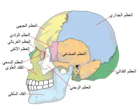 | يتكون من | عظم جبهي ، وفك سفلي ، وعظم جداري ، وعظم أنفي ، وفك علوي ، وعظم وجني ، وعظم وتدي ، وعظم دمعي ، وعظم غربالي ، وعظم صدغي |
