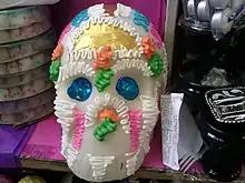 الجمجمة تمثل جمجمة بشرية مصنوعة من مواد حلوى أو غيرها من المواد الخام. ينطبق هذا المصطلح في الغالب على الجماجم الصالحة للأكل أو الزينة المصنوعة (عادة باليد) إما من السكر (المسمى: Alfeñiques) أو الطين الذي يستخدم في الاحتفال المكسيكي بميلاد الموتى (Día de Muertos) والعطلة الكاثوليكية الرومانية يوم النفوس. يمكن أن تشير "Calavera" أيضًا إلى أي تمثيل فني للجماجم، مثل الطباعة الحجرية لـ خوسيه جوادالوبي بوسادا. يتم إنشاء الأكثر شهرة على نطاق واسع مع قصب السكر وزينت بعناصر مثل رقائق ملونة، الجليد، والخرز، والريش. [1]