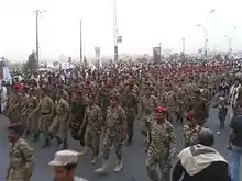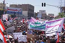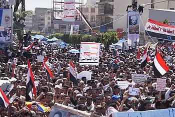 ![]() احتجاجات في صنعاء. بدأت مع بضع مئات في فبراير وارتفعت لعدة آلاف في مارس ومئات الآلاف في ابريل | ||||||