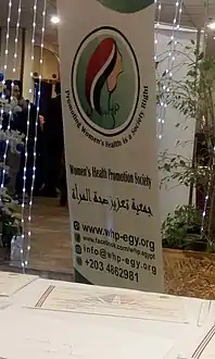 ![]() إعلان لِجمعية تعزيز صحة المرأة أَثناء مُشاركتها في مُؤتمر عُقِدَ في فندق شيراتون المنتزه في مدينة الإسكندرية. | |