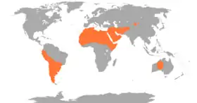 خريطة للعالم تظهر أماكن انتشار الجمليات، قبل إدخالها حديثاً إلى أستراليا وأماكن أخرى. الخطوط السوداء الغليظة تشير إلى مسارات هجرة محتملة.