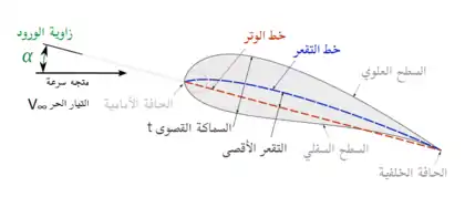 زاوية الورود (زاوية المواجهة) α : هي الزاوية ما بين متجه الجريان الحر للسائل المحيط بالجناح و خط الوتر للجناح الحامل.