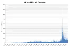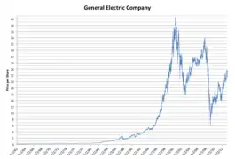 بصفتها شركة مطروحة للتداول العام في بورصة نيويورك، كانَ سهم جنرال إلكتريك أحد المكوّنات الثَّلاثينَ لمؤشر داو جونز الصناعي من 1907 إلى 2018، وهي أطول فترة مستمرة لأي شركة في المؤشر، [112] وبلغت القيمة السوقية للشركة 601 مِليار دُولَار في أغسطس 2000، وكانت حِينَهَا الشركة الأكثر قيمة فِي الْعَالم.[113] في 26 يونيو 2018 أُزيل سهمها من المؤشر وأُستبدل بسهم شركة ولجرينز بوتس أليانس.[114] وقبل إزالته كانَ سيىء الأداء حيثُ انخفض أكثر من 55 بالمائة، [115] وفقدت الشركة المزيد من قيمتها بعدَ إزالة سهمها من المؤشر.[116]