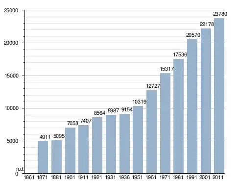 في سنة 1871 بلغ عدد السكان 4٬911 نسمة، وتطور العدد ليصل في سنة 2011 لـ 23٬780 نسمة.