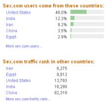 صورة تظهر معدلات الزوار لأحد المواقع الجنسية حسب إحصائيات "أليكسا" ويظهر أن أكثرهم يقعون في الولايات المتحدة، ويلاحظ أيضا ارتفاع النسبة في كل من مصر وإيران والهند والصين.