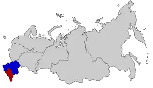 خريطة عامة لروسيا ، تُظهر جنوب روسيا بالألوان ( المنطقة الفيدرالية الجنوبية باللون الأزرق ومنطقة شمال القوقاز الفيدرالية باللون الأحمر).
