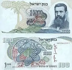 | 100 جنيه إسرائيلي | 180X90 مم | أزرق | بنيامين زئيف هرتزل | شعار الدولة ويحيط به بنو إسرائيل | ![]() | 27 فبراير، 1969 |