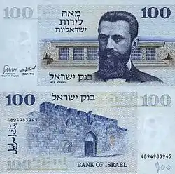 | 100 جنيه إسرائيلي | 147X71 مم | أزرق | تيودور هرتزل وبوابة الدخول لجبل هرتزل | باب النبي داود | ![]() | 14 مارس، 1975 | |
