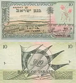 | 10 جنيهات إسرائيلية | 150X82 مم | أخضر | منظر لواد وحقول مزروعة | لوحة تجريدية | ![]() | 4 أغسطس، 1955 | |