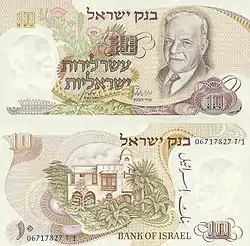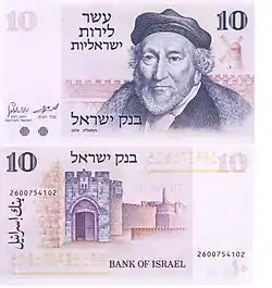 | 10 جنيهات إسرائيلية | 135X76 مم | بنفسجي | موسى مونتيفيوري وحي مشكنوت شأنانيم في القدس | باب الخليل | ![]() | 30 يناير، 1975 | |