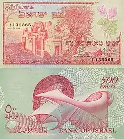 | 500 جنيه إسرائيلي | 153X76 مم | عاجي وبني | دافيد بن غوريون ومكتبة كيبوتس سديه بوكير | باب الرحمة | ![]() | 26 مايو، 1977 |
