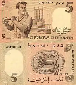 | 5 جنيهات إسرائيلية | 140X78 مم | بني | عامل يحمل مطرقة على خلفية مصنع | ختم أسد يزأر، الذي يقع في تل مجدو | ![]() | ||