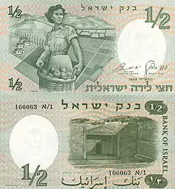 | نصف جنيه إسرائيلي | 130X70 مم | أخضر | شابة ملتحقة بمنظمة الشباب الطلائعي المحارب (ناحال) تحمل سلة برتقال وبالخلفية حقول | مقابر السنهدرين | ![]() | 15 أكتوبر، 1959 | 31 مارس، 1984 |