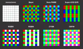 - أنظمة تستخدم مجسات كل منها مغطي بمادة نافذة للون واحد، وموزعة في شكل مصفوف، وهو نوع مصفوف باير .