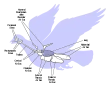 جهاز التنفس عند الطيور[1] تتنفّس أنواع الطيور المختلفة بطريقة أكثر كفاءة من جميع الحيوانات الفقاريّة البريّة الأخرى، إذ يمرّ الهواء من خلال قنوات الرئتين ومن خلال أوعية دمويّة صغيرة تسمّى بالإنجليزيّة (Parabronchi)، حيث تحدث عمليّة تبادل الغازات، ومن الجدير بالذكر أنّ نظام التنفّس لدى الطيور أحاديّ الاتجاه، فالهواء يتدفّق من خلال القصبات الهوائيّة باتّجاه واحد فقط، حيث يشبه هذا التدفّق الأحاديّ الاتّجاه خياشيم الأسماك، وهذا بخلاف الحويصلات الهوائيّة ذات النهاية المغلّقة لدى الثديّيات. الشهيق والزفير لدى الطيور يمرّ الهواء في دورة التنفّس لدى الطيور من خلال عدّة مراحل تتمثّل بما يلي: