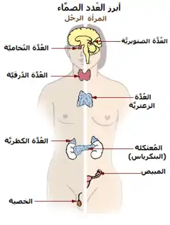 ![]() الغدد الصمّ الرئيسية. (أنثى يمين، ذكر يسار) 1. الغدة الصنوبرية 2. الغدة النخامية 3. الغدة الدرقية 4. الغدة الزعترية 5. الغدة الكظرية 6. البنكرياس 7. المبيض 8. الخصية | |