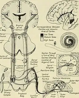 | يتكون من | قشرة سمعية ، وأذن ، وأوكلاهوما ، والعصب القوقعي ، والعقدة الحلزونية ، وجسم زيتوني |