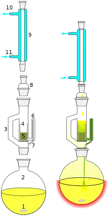 يسخن المذيب لإعادة الإذابة. يسافر بخار المذيب في ذراع تقطير، ثم يفيض إلى الغرفة المحتوية على المادة الصلبة المراد الإستخلاص منها. يضمن المكثف تبريد أي بخار للمذيب حيث يقطر على الغرفة المحتوية المادة الصلبة.