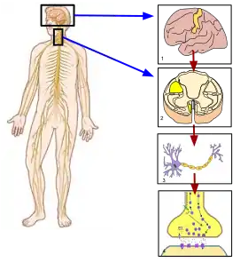 2. (مقطع عرضي في الحبل الشوكي) المجرى القشري النخاعي: الوسيط بين الرسائل القادمة من الدماغ والعضلات الهيكلية. 3. المحور: الخلية الرسولة التي تحمل الأمر بانقباض العضلات. 4. الوصلة العصبية العضلية: تخبر خلية المحور الرسولة الخلايا العضلية بأن تنقبض عند هذا التقاطع. | |